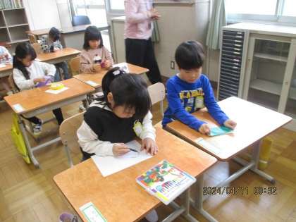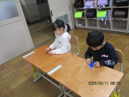 朝の準備が終わったら、「のんびりタイム」です。折り紙をしたり、お絵かきをしたり・・・自分で選んでのんびり過ごしています。