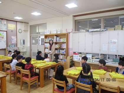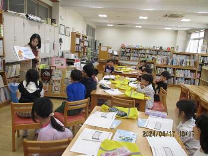 国語科の学習で、色々な絵本の読み聞かせをしています。この日は図書室へ行きました。司書の先生に図書室の使い方を聞いたり、読み聞かせをしてもらったりしました。一人2冊好きな本を借りました。1週間借りることができます。100冊読むことを目標に読書に親しんでいきたいです!