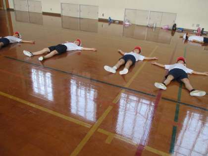 体育館では、「からだほぐしの運動」でストレッチをしました。体の力をぬいて脱力することも大事です。みんなリラックスするのがじょうずでした。