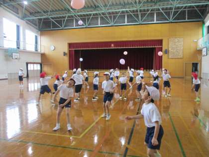 風船バレーは大人気!おとさずパスし合うのはとても楽しいです。