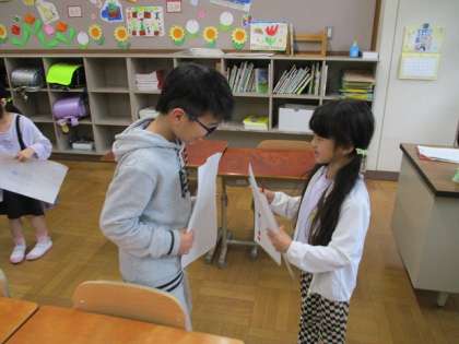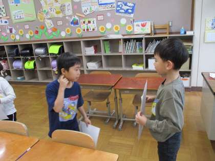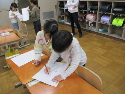 国語科で「どうぞ よろしく」の学習をしました。みんなのお名前を早く覚えたい!という子どもたにち。自分の名前を丁寧に書き、自分の好きなものも添えてカードを作りました。「私の名前は〇〇です。私の好きなものは〜です。どうぞよろしくお願いします」「あ!私もそれ好きだよ!」など自然と笑顔で交流できた子どもたちでした。