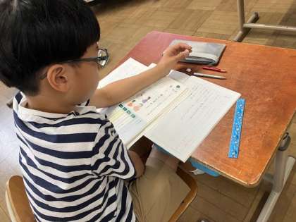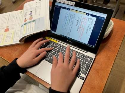 国語の学習では、授業の内容をノートにとる人と、タブレットにまとめる人に分かれています。自分の考えがまとめやすい方法で授業を受けています。