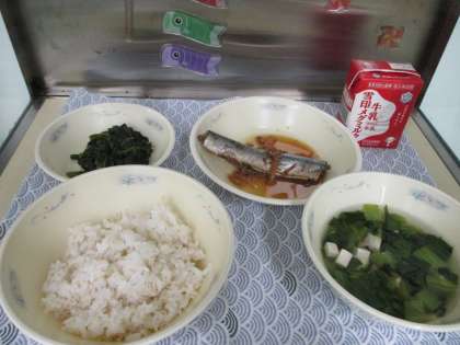 ゴールデンウイークの連休明けの献立は,『さんまのしょうが煮』でした。千切りの生姜と料理酒・しょうゆで煮汁を作りさんまをコトコト煮ていきます。弱火でじっくり炊くことでふっくらっと柔らかくなり食べやすいです。ご飯がススム献立ですが,子どもの中には煮魚が苦手な子もいて,連休明けのおかずには厳しそうでした。