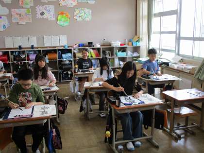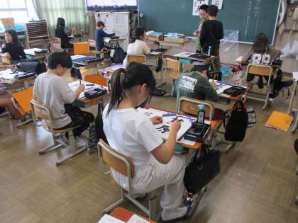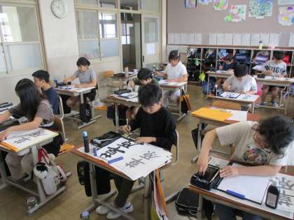 書写で毛筆の学習を行いました。久しぶりの毛筆で、初めの練習では、筆の調節が難しそうな様子でしたが、何枚か書き進めると、バランスの取れた文字が書けるようになってきました。最後の一画まで丁寧に書くように頑張る姿が見られました。