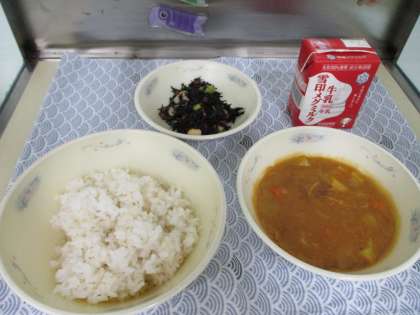 今日は大人気の『ポークカレー』でした。【ポーク】なので牛肉のカレーには入らない料理酒が入りました。朝9時半からたまねぎをきつね色になるまで炒めてじっくりコトコト煮込んでいきます。新玉ねぎの甘〜い匂いが調理室いっぱいに広がっていました。中間休みには,外からのぞき込んでくる子どもたちもいました。