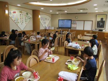 給食の時間はランチルームで食べました。「三角食べ」や「イナズマ食べ」「口中調味」など食べ方について話を聞き、給食で試してみました。また、明日からも食べ方を工夫しておいしく食事をしてほしいと思います。