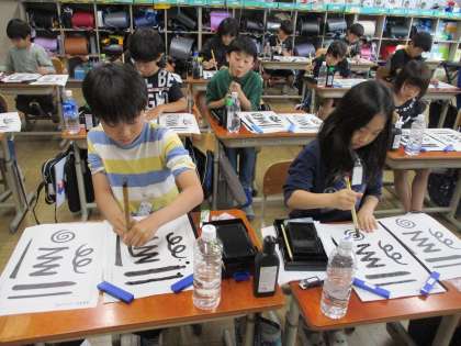 筆をおろし、道具の名前や並べ方を教わり、姿勢を整えて、心のこめて墨をすりました。