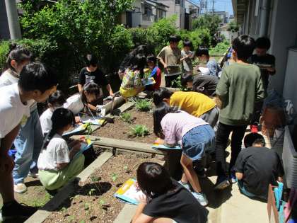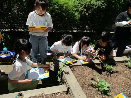 畑でしっかり観察ノートを書いています。タブレットで撮影している人もいます。