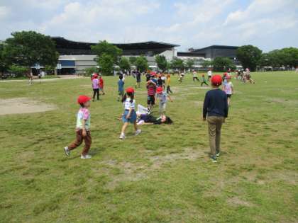 広い芝生でたてわりリーダーの6年生が考えた遊びをみんなでしました。