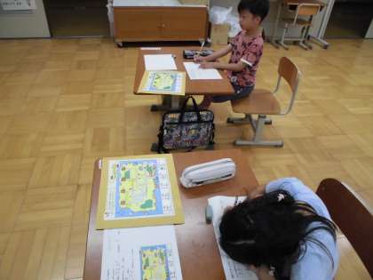 先日の続きで、今回は自分でたからさがしのヒントの文を考えました。2回目の学習なので、方位や地図記号はばっちりなことに加え、言葉の使い方も少し上手になってきて、スムーズに学習を進めることができました。子どもたちもニコニコとっても楽しそうでした。