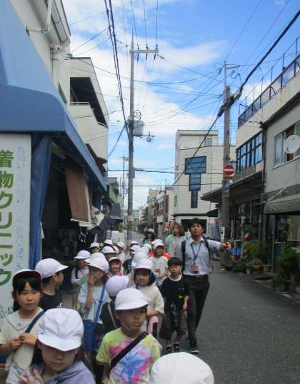 南大内小学校のまわりには、どんな場所やお店、人がいるのかな。まわりの様子をよく見て、いろいろなものを発見して帰ってきました。また、安全に気を付けたり、生活している人やお仕事をしている人に迷惑にならないように気を付けて道を歩くこともできました。