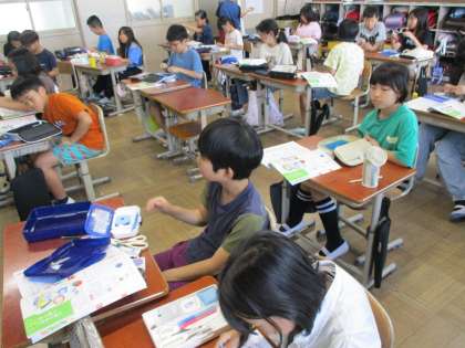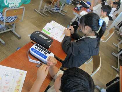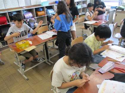 家庭科の学習で、玉結びの練習をしました。教科書にやり方が書いてありますが、実際にやってみると、なかなかうまく玉が作れず、苦労している子が多かったです。一つできるとどんどん自分で作ることができ、友達にも「こうしたらできるよ」とコツを伝えていました。