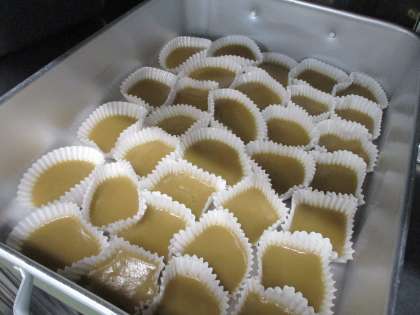 『ういろう』は,江戸時代から伝わる「和菓子」です。米粉・黒砂糖・砂糖を混ぜて,一つずつカップに入れ,スチームコンベクションオーブンで蒸して作りました。給食室で作った手作りデザートです。『ういろう』のもっちりとした食感や,黒砂糖の優しい甘味を味わいました。1年生は初めて食べる子もいたようですが「食べたことがないから,どんな味かなぁと思って楽しみにしていた」「おいしい〜」と言っていました。