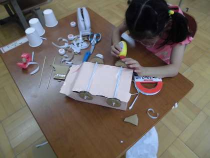 風の力で走る仕組みを使って、自分が思った形に合う形や色を見つけ、楽しい飾りを工夫しオリジナルの車を作ります。今回は、本体とタイヤづくりに取り組みました。どんな車ができるか楽しみです。