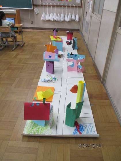 どんどんアイデアが出てくる子どもたち。せっかく作った作品をどうしようか・・・。「大きな紙においていったら町ができるやん!」ということで、模造紙に道路や池などを描いて・・・。みんなの作ったものを置いていきました。友達の作品の素敵なところを見て、ロイロノートで写真を撮りました。タブレットも慣れてきましたね。