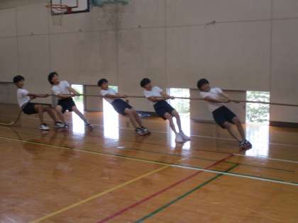6月26日に,綱引き練習の1回目がありました。試合に申し込んだ40名ほどの児童が,体育館で力いっぱい綱を引きました。