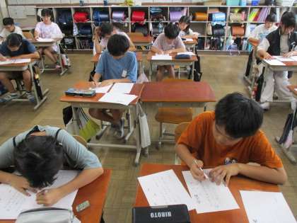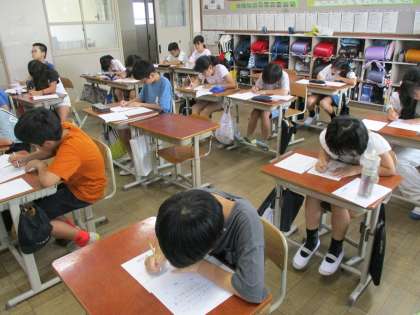 鉛筆で書く硬筆書写をしました。竹取物語の一部を視写しました。鉛筆書きですが、硬筆書写のコンクールに出すものなので、「消しゴム禁止」「二度書き禁止」というきまりがあります。子どもたちは、間違えられないようにしようという気持ちと、お手本を見て丁寧に書こうというすごい集中力で、教室中シーンとなり、よい緊張感の中、文字を書いていました。みんなの気持ちのこもった良い字が見られました。