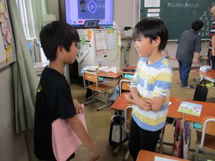 外国語活動で、英語を使って、友達とお話をしました。How are you?と挨拶をして、聞きたいことを聞いて、じょうずに話せるようになってきました。楽しそうにインタビューできるところがすてきですね。