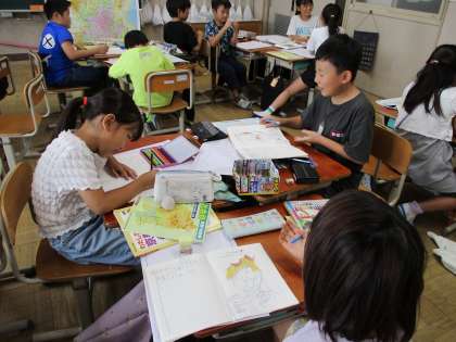 京都市の地形や、主な河川や山、交通や鉄道などを白地図に書いて学習しました。地図にふれるのは、3年生になって初めてですが、親しめるようにがんばっています。学校にある大きな地図の中から、山の中にあるお寺を見つけた子もいました。