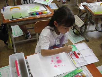 道具の名前や正しい使い方を学んだ後、絵の具の使い方や色の混ぜ方、ぬり方など色々と試しながら、思い思いに画用紙に模様をかいたり、色をぬったりして楽しみました。