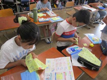 家庭科の裁縫の学習で、ボタン付けやなみ縫い、半返し縫いなどの縫い方の練習をしました。みんな集中して縫っていました。