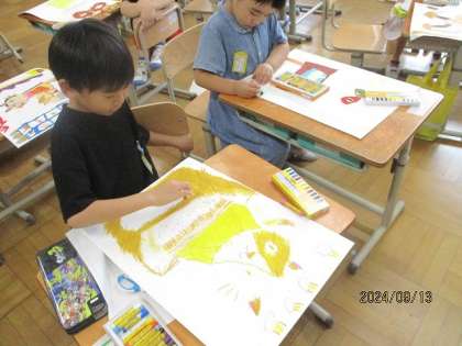 「どすこいみいちゃんパンやさん」の絵本を読んで、一番好きな場面を画用紙に書きました。コンテを使って下描きをして・・・パスで色を塗っています。どんな作品になるのか楽しみです!
