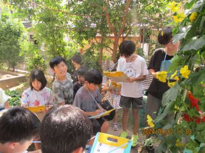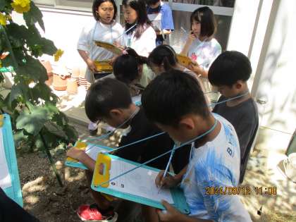 1学期と比べて、大きくなったヘチマを見て、子どもたちは植物の成長に興味津々になり、