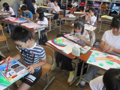 図画工作の時間に国際平和ポスターの色塗りをしました。「平和」をイメージすると何色がいいかな?と子どもたちは考えながら塗り進めていました。