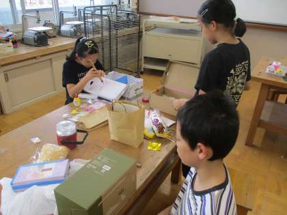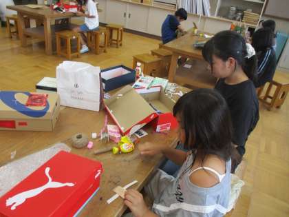 図画工作科の「のぞいてみると」の学習では、箱を使った工作に取り組んでいます。箱の中をのぞくとどんな世界が広がっていると楽しいかな…といろいろとイメージを広げながら楽しんで作っています。