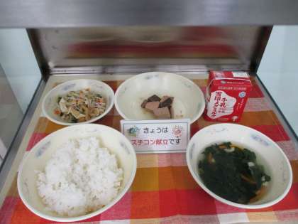 「なま節」はかつおを茹でて,蒸した後に,けむりでいぶして作ります。「なま節」が苦手な子どもも多いですが,今日は運動会だったこともあるのか,しっかり食べてくれていました。