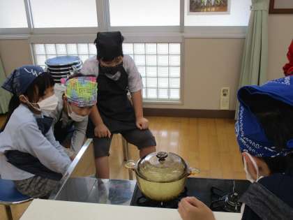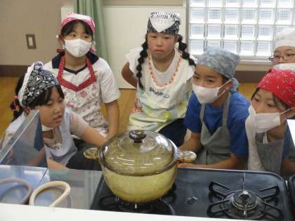 4時間目に、鍋の中が見えるガラスの鍋でご飯を炊きました。子どもたちは、お米の炊ける様子をじーっと観察していました。炊けたお米は、とてもふっくらしておいしかったです。