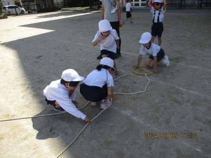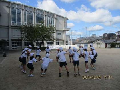 運動会が終わってすぐの体育は「とびあそび」でした。ジャンプが好きな子どもたち。色んなとび方をしていると・・・空に大きなくじらぐもが!!!「みんなで輪になってとんでみよう!」とあっという間に一つの輪になりました。「天までとどけ!一、二、三!!」と元気にジャンプ!!本当に飛んで行ってしまいそうになりました。今日はお休みしていたお友達もいたので、またみんなでやってみたいですね。