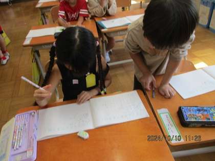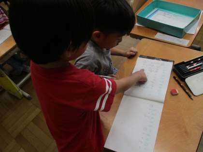 たしざん(2)のくり上がりのある足し算の単元に入りました。はじめはブロックを使って考えていましたが、言葉を言いながらさくらんぼ計算にも挑戦。お友達と見合いながら、みんなで解きました!