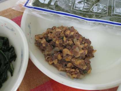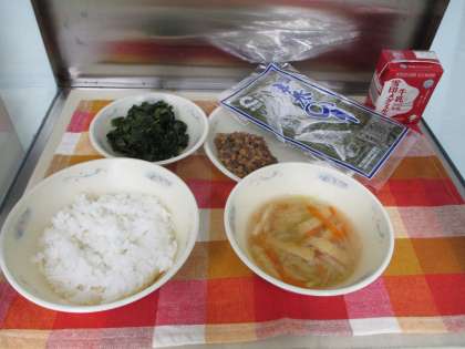 【納豆】は,日本の伝統的な発酵食品で,蒸した大豆に「納豆菌」を混ぜて作ります。【納豆】には,血液をサラサラにしたり,お腹の調子を整えたりする働きがあります。給食では『肉みそ納豆』に使いました。にんにく,しょうが,九条ネギ,たまねぎを炒めて,【赤みそ・砂糖・料理酒・醤油・米酢】で調味します。そんなに納豆の匂いもきつくなくご飯と一緒にのりに巻いて食べるので,納豆が苦手な子どもも「これは食べれた〜」と教えてくれました。