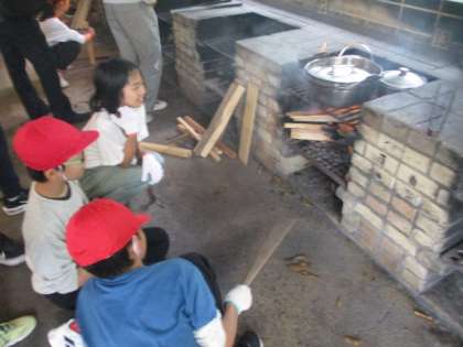 切った具材はお鍋に入れて,かまどに点火です。