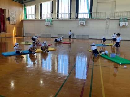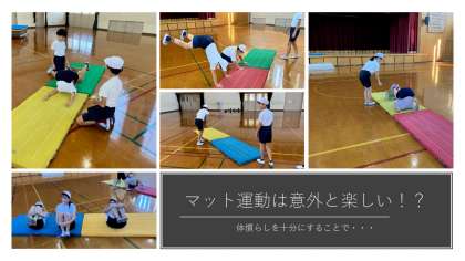 体育ではマット運動が始まりました。事前のアンケートでは「マットは苦手。」「嫌い。」という声が多くありました。技が出来ないから苦手や嫌いになることが多いみたいですが、少し工夫をしてその出来ないを出来るに変えていきます。