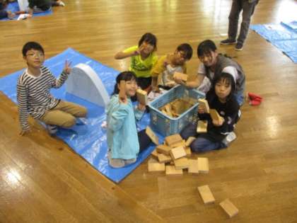 水色の型板に合わせて木を組んでいき,最後に型板を抜きます。