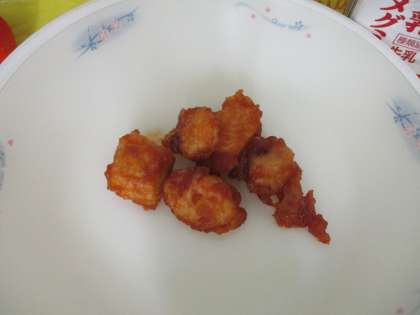 『チキンのアングレス』は,鶏肉を塩コショウ・料理酒につけてから米粉・片栗粉を混ぜた粉をつけて油で揚げます。揚げた鶏肉をウスターソース・砂糖・トマトケチャップ・水を混ぜ合わせたソースにからめて仕上げます。鶏肉が柔らかくケチャップ味でどのクラスもきれいに食べてくれていました。