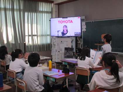 社会科の学習で、TOYOTAとリモートでつながり、自動車の作り方を学習しました。どのような流れで自動車が作られるのかよく分かりました。質問にもすぐに答えていただき、子どもたちは自分たちの疑問が解決できてすっきりした様子でした。