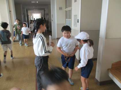 中間休みに本部委員会主催のハロウィンのイベントに参加しました。校舎内のいろんなところに隠されている文字を探し、全部探して文字を並び替えるとハロウィンに関係のある言葉ができるというものです。ニコニコグループの3年生と一緒に探しました。出来上がった言葉をゴールで本部委員さんに伝えると、ハロウィンのしおりがもらえました。少しの間ですが、ハロウィン気分を味わいました。