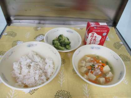 今日の『ブロッコリーのおかか煮』に南大内では【ブロッコリー】を8キロ使いました。茎も使いつぼみは小ふさに分けたのですが,2人で1時間以上ブロッコリーを切っていました。子ども達もとても美味しいと言ってくれて,2年生は「明日もこれが食べたい〜」と言ってくれました。
