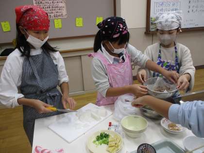家庭科「食べて元気!ご飯とみそ汁」の学習で,みそ汁づくりの実習をしました。みそ汁の実は大根と油揚げとネギです。子どもたちは、グループで協力して作業を進めていました。みそ汁の濃さに好みがあったようですが,どのグループも美味しくできて良かったです。