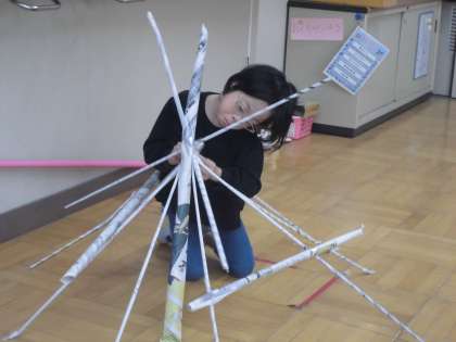 新聞紙を細く丸めた棒を使って、立体的に立ち上がるように自分のすきな形に組み上げて作品作りをしました。新聞紙の棒をどんどんつなげていくのですが、弱いところや折れそうなところが出てきて、補強したり支えの棒を立てたりと試行錯誤の連続です。作品の中に入り込んで集中して取り組んでいます。最後にどんな作品が出来あがるのか楽しみです。