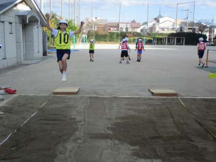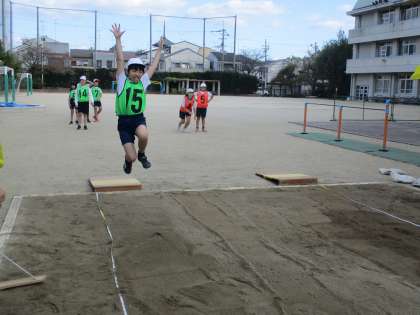 体育科では走り幅跳びの学習をしています。足の合う助走の距離を見つけられたので、今日は「力強く踏み切る」や「跳んだ時に手を挙げる」などの遠くに跳ぶためのコツを意識して距離に挑戦しました。