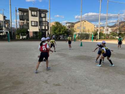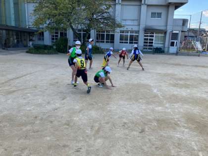 体育は「タグラグビー」が始まりました。初回はタグを使ったしっぽ取りをして、攻め方やタグの取り方を確認しました。どんな作戦だとたくさんのタグを取ることができるのかチームで相談していました。