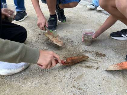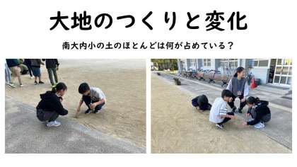 理科では「大地のつくりと変化」という単元に入りました。地層の様子を知るために校庭の土を掘り、その土には何が多く含まれているのか調べました。