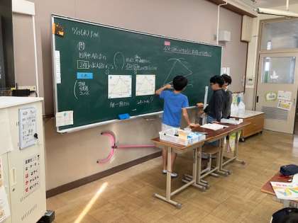 前回と同じように算数の時間は考えを伝え合っています。今日は元の図形(四角形)を2倍にした拡大図のかき方を考えました。
