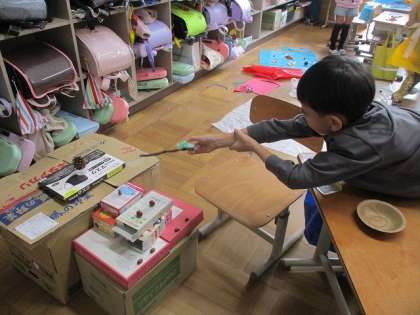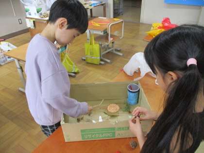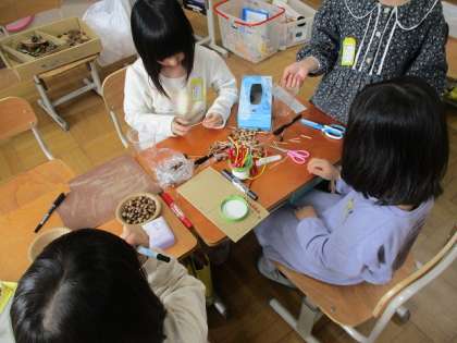 生活科では公園で拾ってきた木の実や落ち葉などを使って遊びたいという話になりました。それぞれが遊びたいものを作りました。そのおもちゃを使って、楽しいお祭りを開きたいということで、「あきのフェスランド」と子どもたちが名付けたおもちゃランドをひらく計画をしています。休み時間も準備をする子どもたちの様子が見られます!