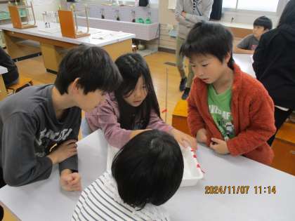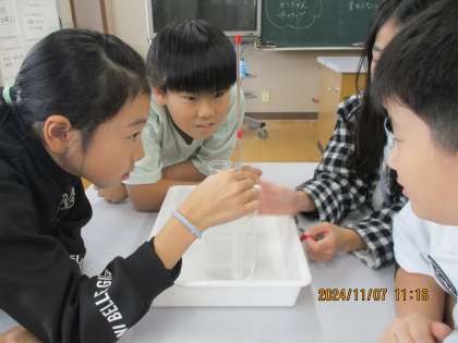 温めるとゼリーが上に移動し、冷めるとゼリーが下に移動した結果を見て、子どもたちもびっくりしていました。