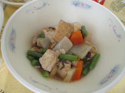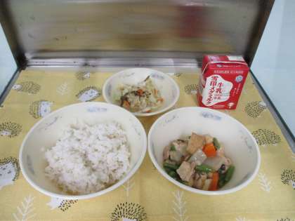 『厚あげのふきよせ煮』には,厚あげや鶏肉・こんにゃく・にんじん・たけのこ・しいたけなどを使っています。「ふきよせ」とは,風に吹き寄せられて集まった木の実や葉っぱのように,色どりもよく盛りつけた料理の事です。五感(視覚(目)聴覚(耳)味覚(舌)嗅覚(鼻))を使って味わえる献立です。